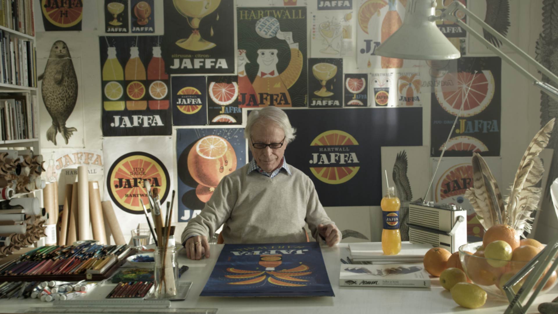 The internationally awarded 85 year old graphic designer Erik Bruun is best loved for his iconic posters and adverts for Hartwell and his work has been awarded the prestigious Pro Finlandia medal. You could call him a Finnish institution. Not only does The Panics commercial make Bruun’s work come alive but he can be seen for the first time in the flesh, sketching the Jaffa logo.